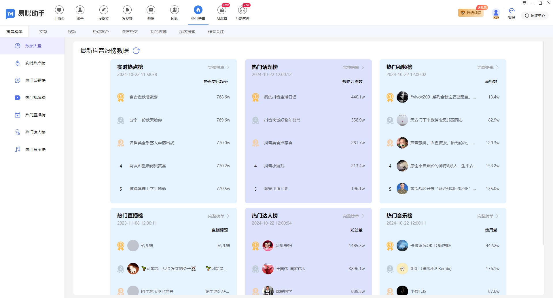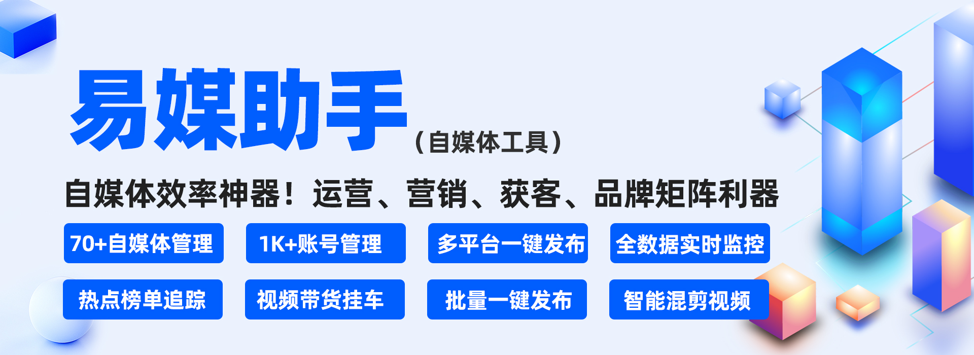 --- 二、自媒体新手效率神器的高效使用路径 1. 多平台管理效率神器的价值 以易媒助手为例,其核心功能覆盖: 账号集中管理:支持B站、抖音、快手等50+平台账号一键切换 智能内容排期:提前7天设置发布时间,自动同步至所有关联账号 数据看板整合:播放量、互动率、粉丝增长趋势可视化分析 2. 新手实操四步法 第一步:账号冷启动配置